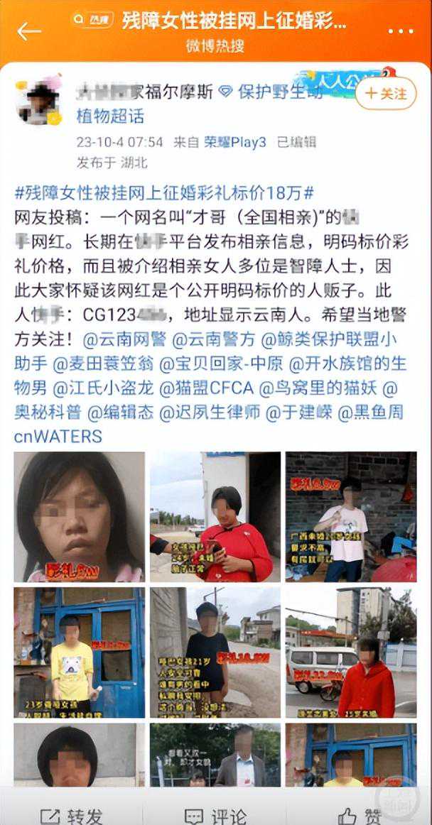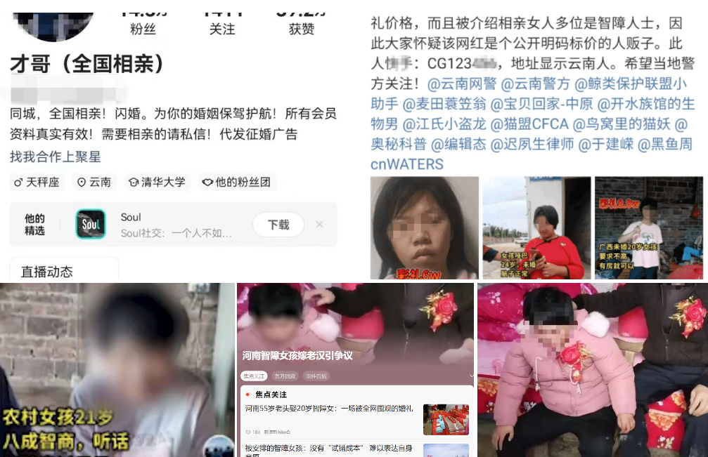 「聘金18.8W,农村女孩21岁,八成智商,听话,能踏实过日子…」网传资讯显示,一个名为「才哥(全国相亲)」的网红主播在某短片平台多次发布征婚讯息,聘金明码标价,涉及的女性不乏智障、身体残障等状况。