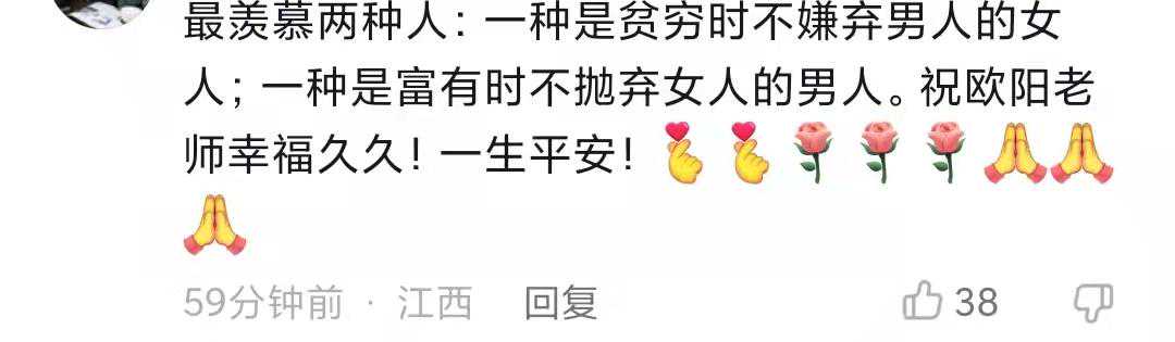不少网友被他们的爱情所打动,有网友感慨老一辈一生只爱一人的爱情观实在是太感人了,欧阳奋强在当龙套时遇见了爱人,成名后也依然专一,这种专情实属难得。