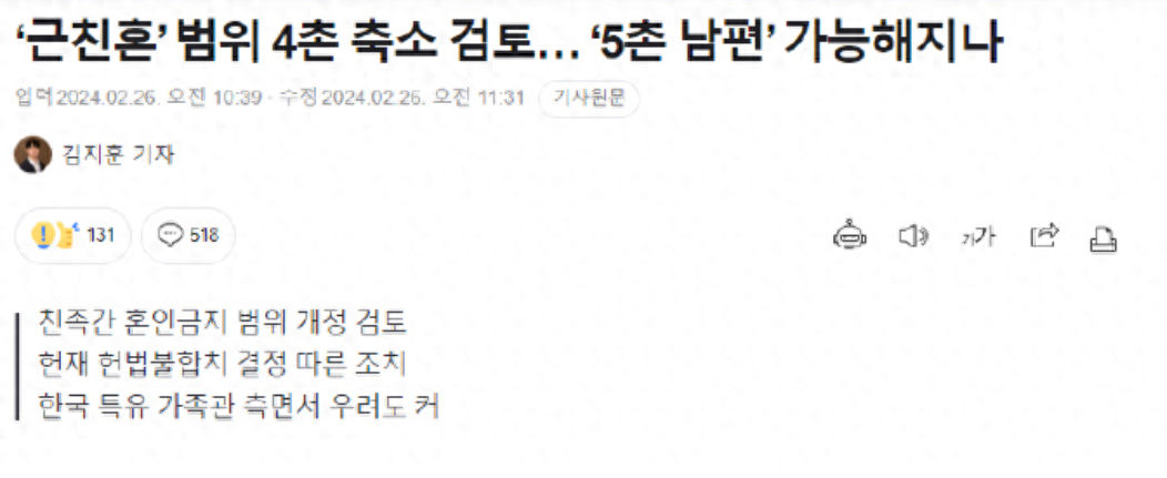 最近韩国法务部,忙着讨论放宽近亲结婚的法律限制,允许8寸以内的血亲结婚,只禁止4寸以内的血亲和直系姻亲结婚。