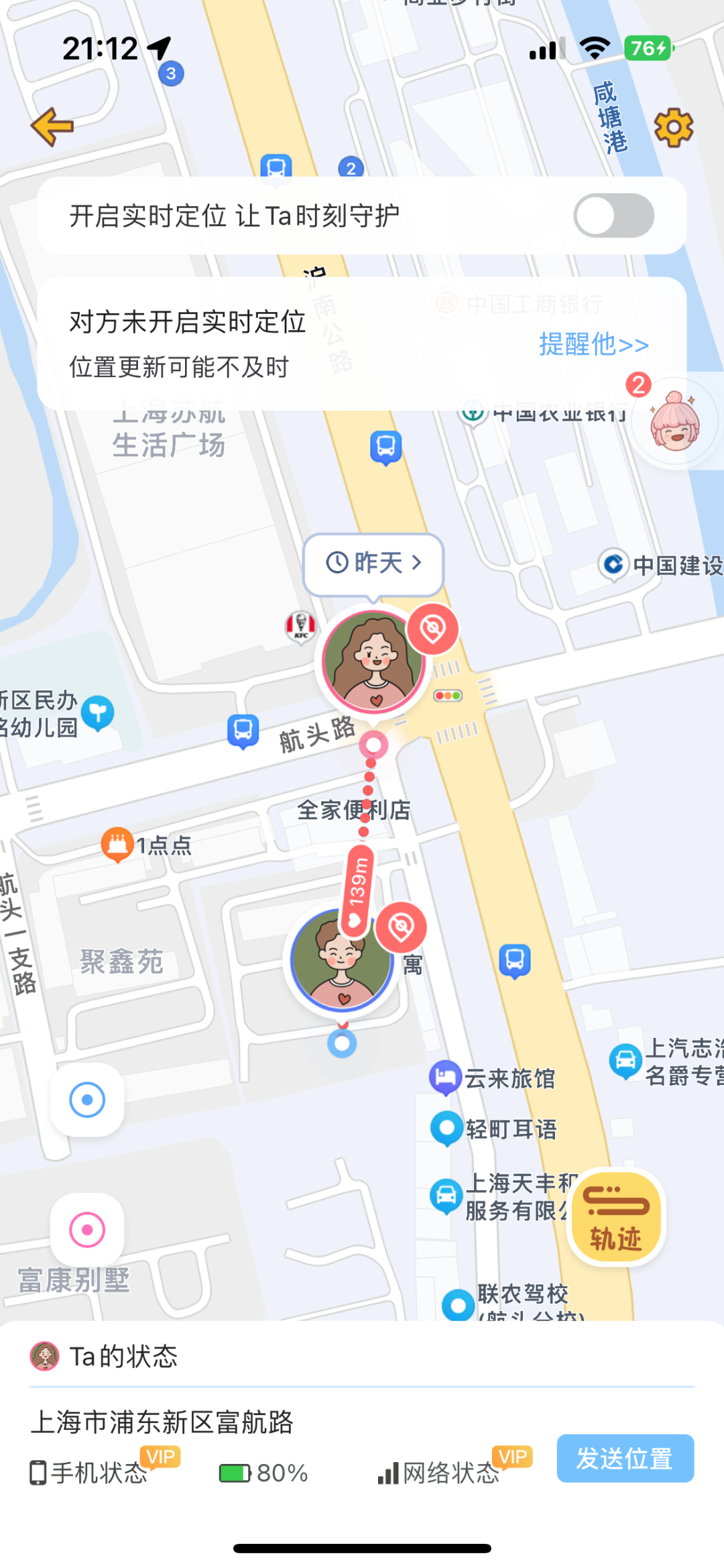 双方都开启定位权限后,就可以实时定位对方的位置,开启会员后,还可查看对方手机使用状态(使用中、锁屏中)和网络状态(有线、WI-FI),情侣慎用,懂得都懂,不然对方都能监控到你去的每一个地方,哈哈。