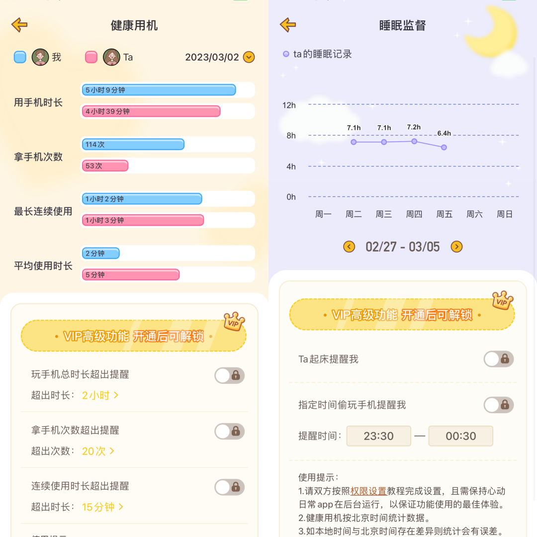 睡眠监督,可以查看到对方的睡眠情况,开启会员,竟然可以对方起床提醒自己、指定时间偷玩手机也会提醒对方;健康用机,可查看对方用手机次数、拿手机次数、最长连续使用时长、平均使用时长;如果开启,感觉是异地恋的福音,被掌握的一目了然。