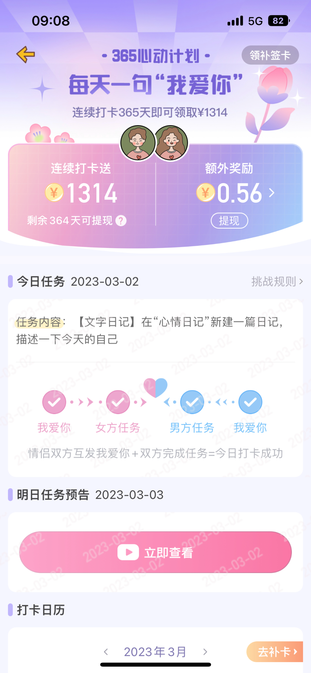 平台推出365天心动计划,规则是每天情侣双方都需要发送“我爱你”,并且双方都需要完成制定任务方可打卡成功,打卡365天,可获得1314元现金奖励,日常打卡也会有随机红包,红包满30元可提现。