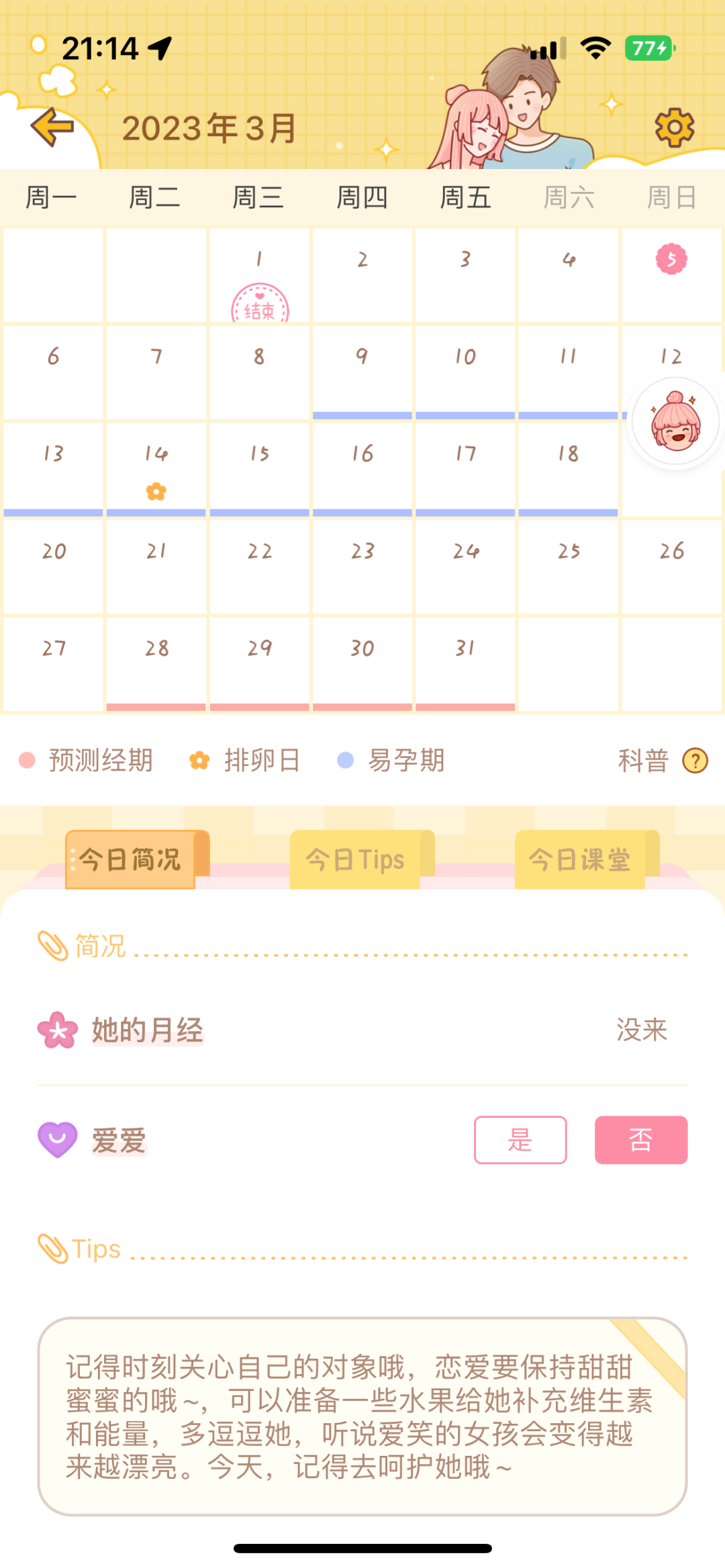 女孩子可以记录大姨妈来的日期,并且推算下一次大姨妈的日期、排卵日和易孕期,通过日历的方式直观的展示出来,男孩子可根据日期,及时地为女朋友送来烫水了。