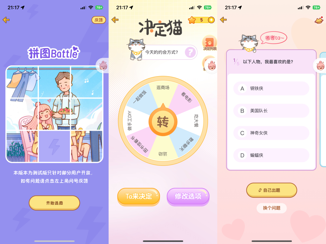 还有类似默契挑战,情侣之前出题供对方回答,考验两个人的默契;决定猫,不知道去哪里旅游?不知道吃什么?不知道玩什么?通过转盘的形式随机转到哪个就决定做什么。还提供一些游戏,比如拼图比赛、五子棋、抓娃娃等游戏,使得情侣之间有了更多的乐趣,使得两个人的感情迅速升温。