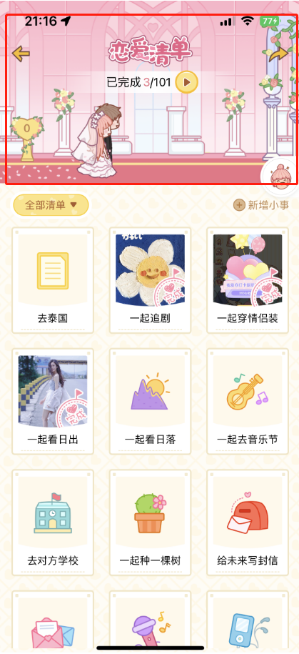 如果不注意以为就是一个背景图,但其实是一个进度条,随着我们完成一个个清单,上面的类似结婚现场一样,动态的展示情侣双方一起挽手盛装走向美好生活,真的感叹软件制作的用心,一个瞬间打动了你。