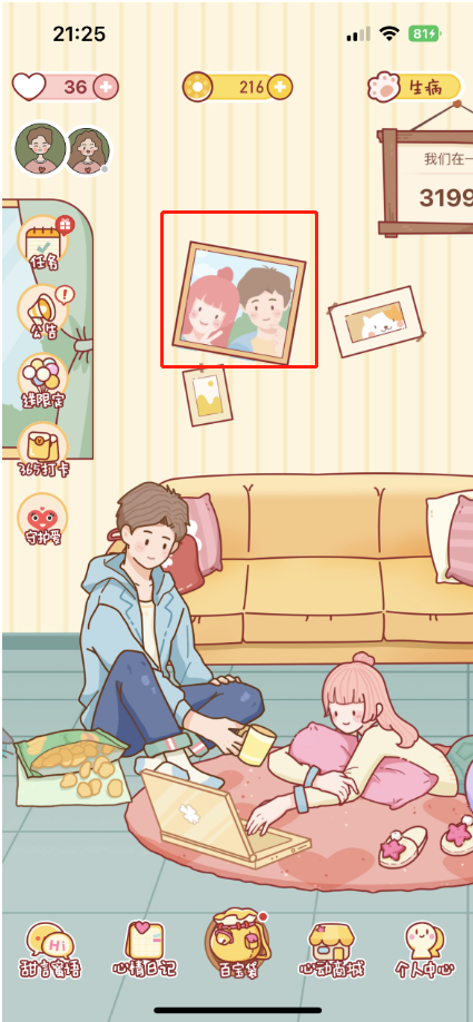 心动小屋,墙上挂的照片也可以通过替换情侣双方的照片,生成一张动漫合照限时,就像两个人真的生活在一个空间一样,有种家的感觉。