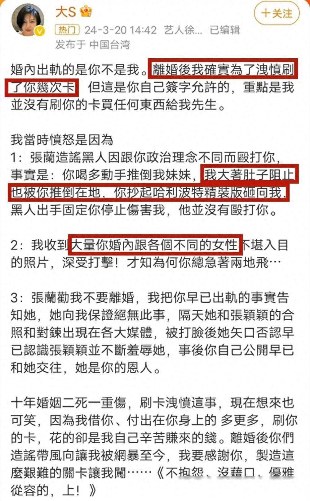 时隔十年,大S亲自下场,重锤十年婚姻,一场重伤!在一纸声明中,她毫不留情地揭露了汪小菲的种种背叛与虐待,震惊了众人。这不仅是一次对汪小菲的痛击,更是对整个婚姻制度的一记警示。