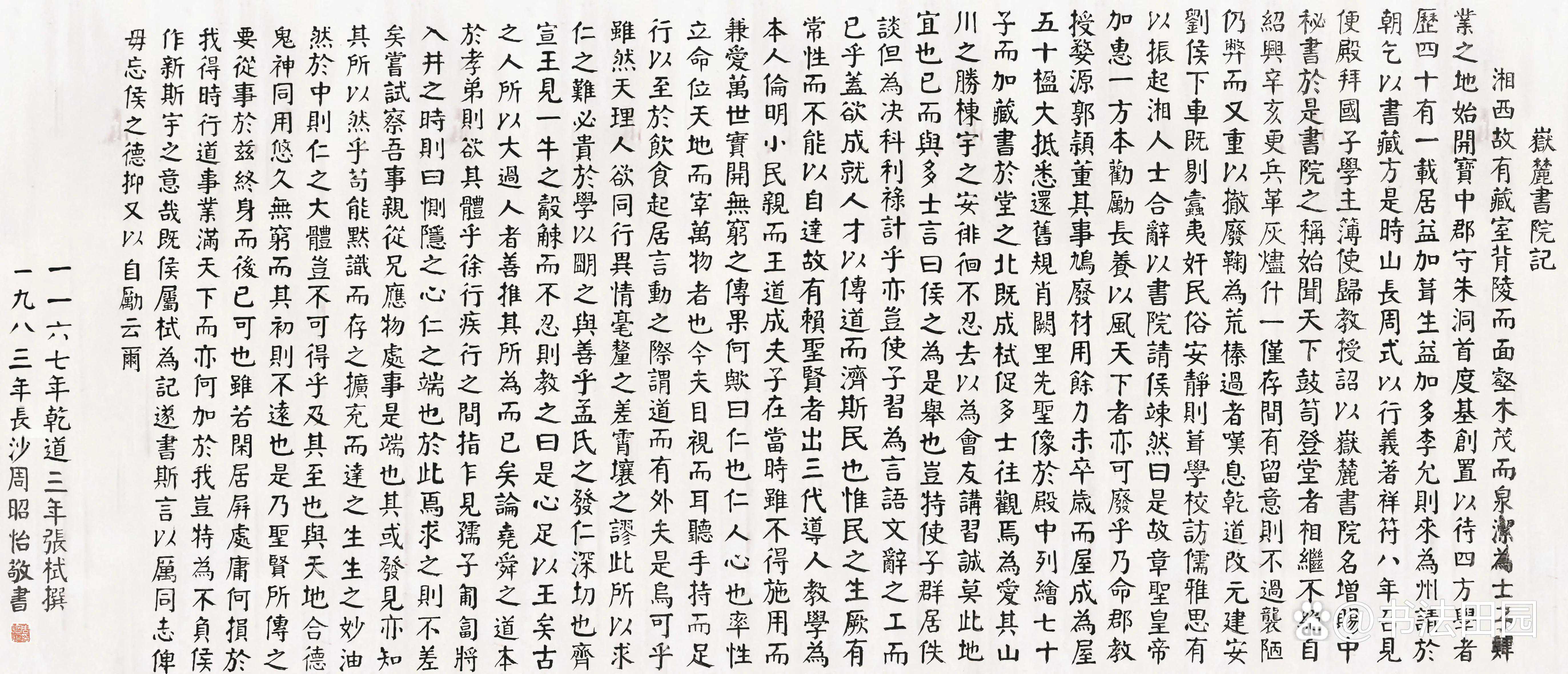 ▲周昭怡为千年学府岳麓书院讲堂屏壁上书写的《岳麓书院记》