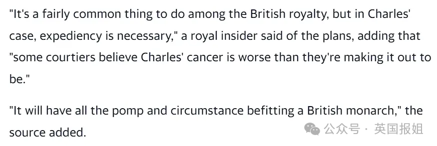 “(虽然提前准备葬礼)在英国王室中是相当常见的做法,但对查尔斯来说,赶紧准备好是必要的。…一些侍从认为查尔斯的癌症比他们透露的要严重。”