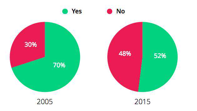 和十年前相比,回答“不”的人显然增加了。据Okcupid的数据显示,变化幅度最大群体是同性恋男子和异性恋女子,前者从83%降到57%,后者从48%降到25%。此外,表示愿意为了“约炮”而和对方上床的用户,和十年相比,从49%降到了41%。