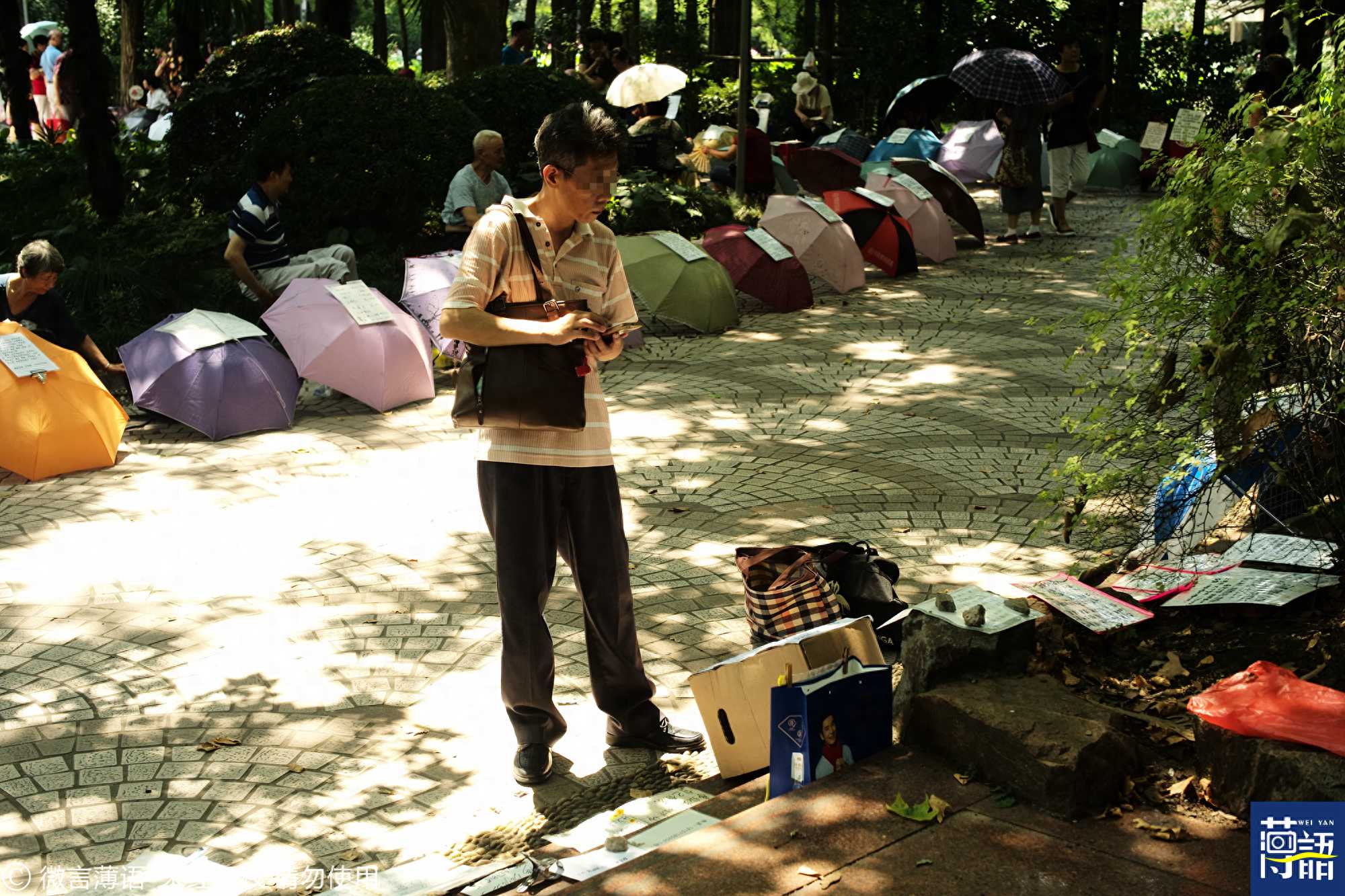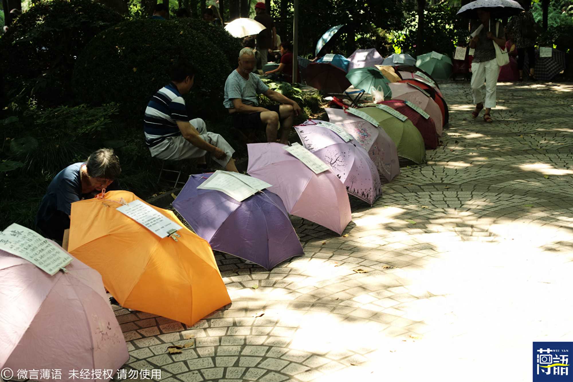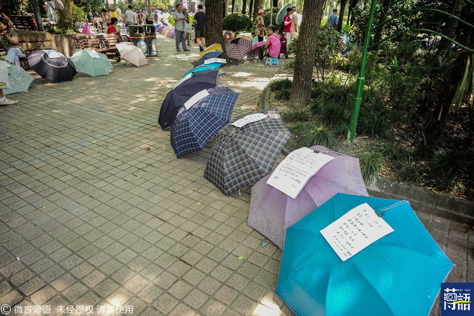 公园的道路两边摆满的雨伞上有着各种不同的征婚信息。