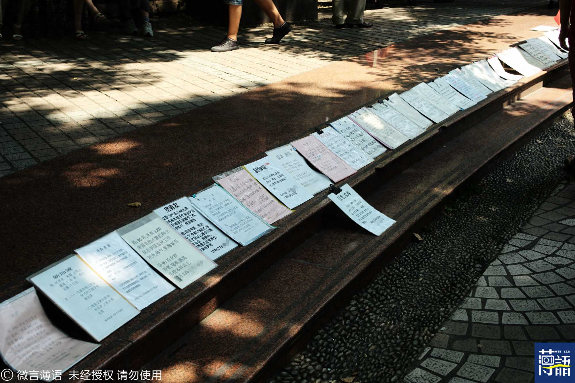 人民公园的一处台阶上摆卖了各种征婚信息。