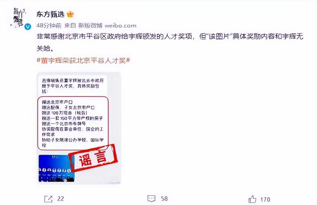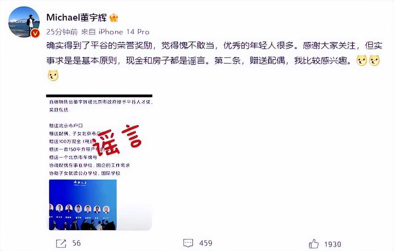 这一句话也被外界解读为他公开征婚的信号,而且他还对他在接受记者采访的时候还表示,平谷人才奖是有奖励的,但是奖励是10万元现金,而不是网传的100万元现金,而且他已经拒绝了这一笔现金。