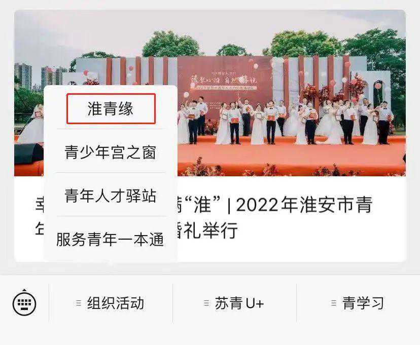 “淮青缘”小程序是淮安市委人才办、共青团淮安市委、淮安市总工会、淮安市妇女联合会联合打造的淮安青年人才线上交友小程序。小程序已于2022年淮安市青年人才户外集体婚礼现场正式发布。