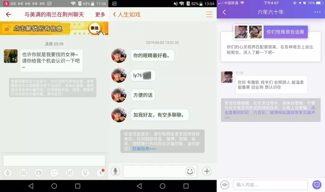 小李分别实名注册了*爱网、百*网、世纪**网APP,发现在与陌生人聊天的过程中,均会出现防范赌博、投资诈骗的安全提醒,其中*爱网甚至列举了长达十项的详细诈骗套路,可见是做过了功课。在这方面,应该为三大平台点个赞。