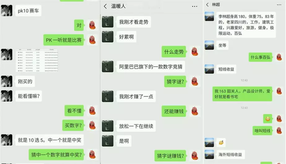小李随机对其中44名男子回复,并有一搭没一搭的聊着。最终,成功添加了10名男子的微信。10名男子中5人在聊天中提到了在网站投资/赌博赚点“快钱”,甚至有2名男子已经开始教小李如何添加客服,在赌博网站充值!