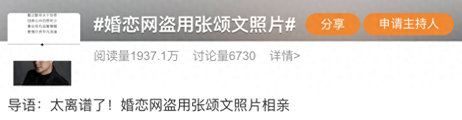 演员张颂文的照片被婚恋网站盗用一事,于4月4日晚在网络发酵。词条,在微博上成为热搜。