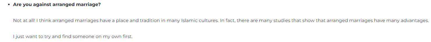 “我不反对包办婚姻。我觉得包办婚姻是伊斯兰文化中很重要的传统部分。