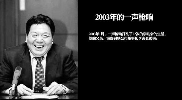 2003年1月22日,李兆会的父亲、海鑫集团的创办人李海仓在办公室遇刺,凶手是和他恩怨交缠的发小冯引亮。