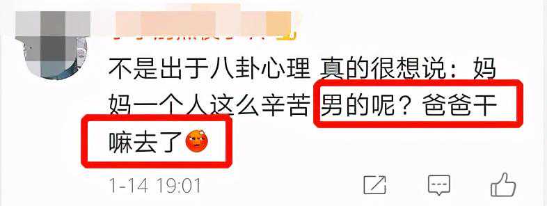 有网友质疑:“孩子爸爸呢?”“妈妈一个人这么辛苦,男的呢?爸爸干嘛去了?”言语中饱含着对父亲缺位的愤怒。