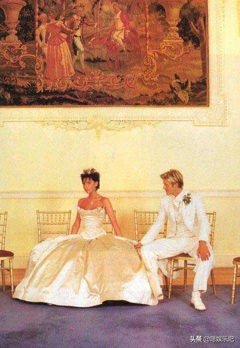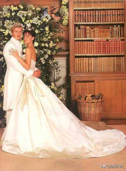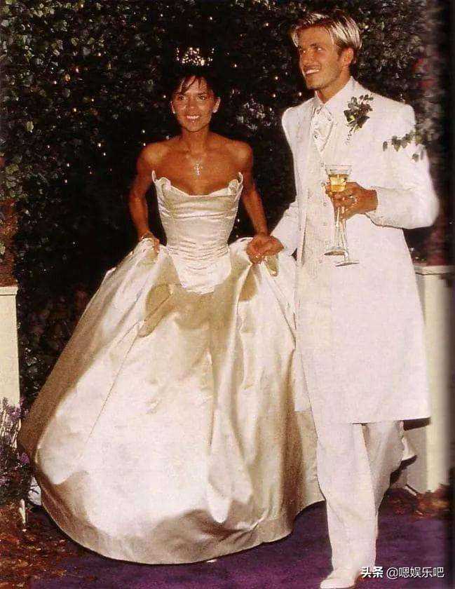 维多利亚1999年的豪华婚礼上的这件嫁衣长达20英尺,也成为当时最昂贵的婚纱,$100.000(约RMB61万);设计非常简洁大方,几乎没有累赘的蕾丝、花边、蝴蝶结之类的装饰,胸口处飞扬向上的抹胸造型如同她火辣张扬的个性,头顶的王冠则给她添加了一份高贵和霸气。