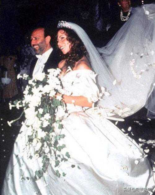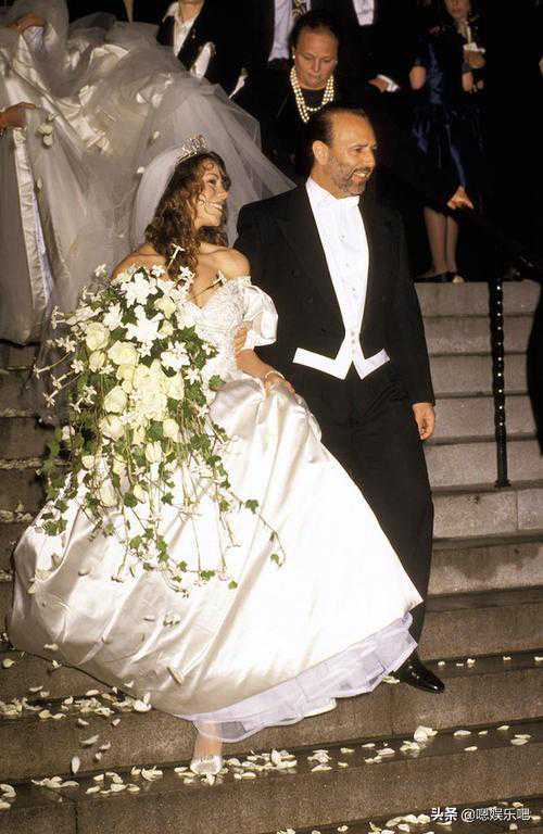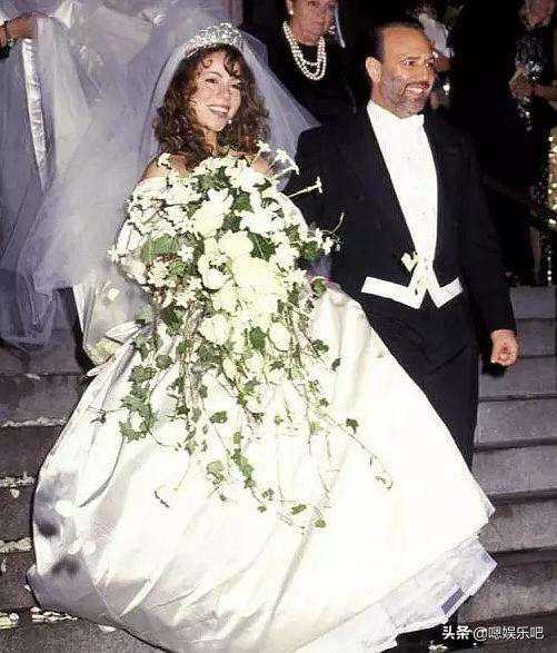 玛丽亚凯莉1993年身穿这件VeraWang婚纱,钻石头冠的公主风,形象地说明了当时玛丽亚-凯莉的灰姑娘变公主的传奇性经历,因为她与第一任丈夫哥伦比亚唱片公司的总裁TommyMottola结婚。奢华的绸缎和巨长的裙摆都显示了天后的气场,还有那略带泡泡袖的袖子,宛如优雅的公主一般。
