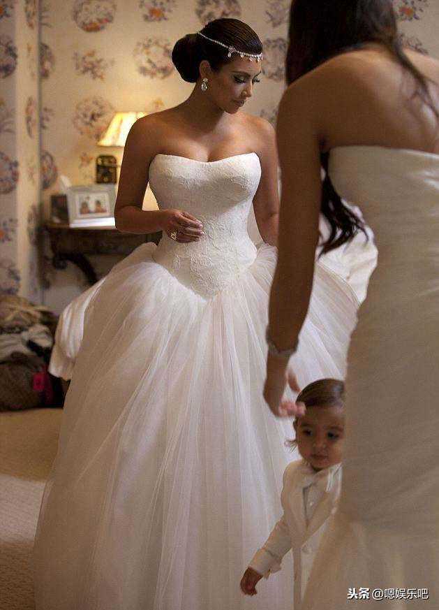 金卡戴珊和前夫结婚时也是身着VeraWang婚纱,简约的设计完美凸显了她的傲人身材,独特的头饰提升了整体的气质,非常有高贵冷艳公主的感觉。