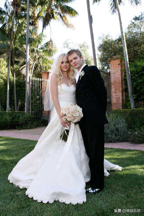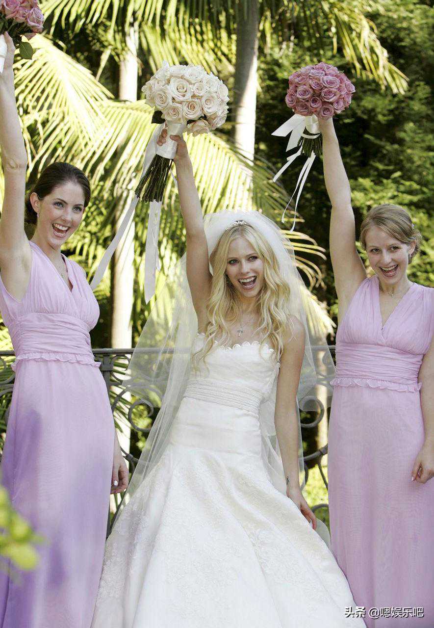 艾薇儿身穿抹胸花边式婚纱,裙摆与抹胸的花边呼应,简洁大方的剪裁和甜美的花边彰显独特,变得温柔动人,很是清新养眼。