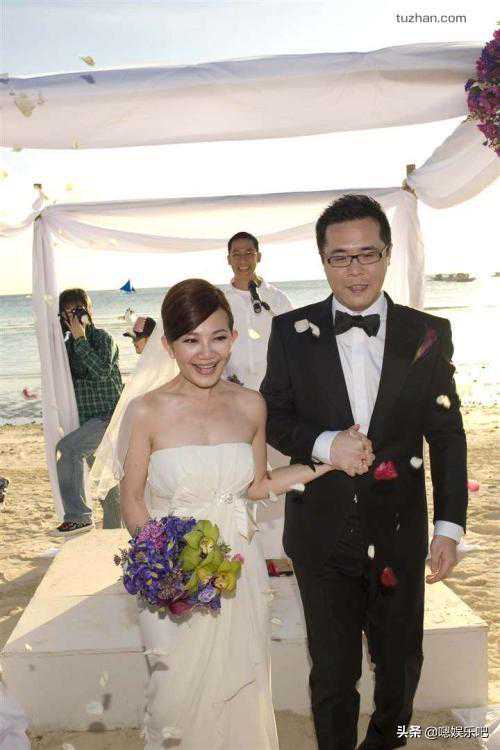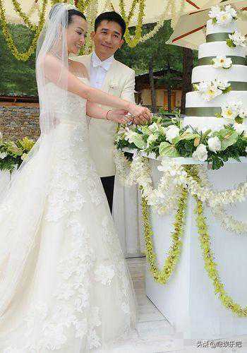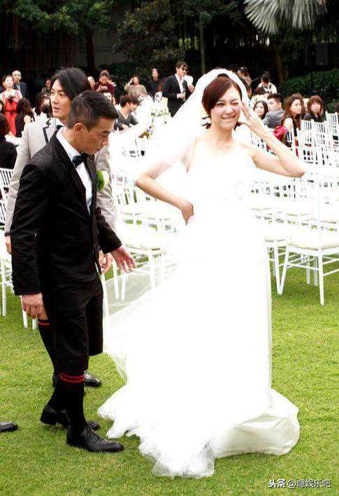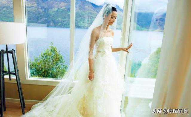 刘嘉玲的嫁衣全部采用手工制作,要价120万台币,抹胸式设计,款式简洁,但十分精致,长长的拖尾婚纱尽显她的小女人气息。