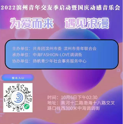 /滨州网综合讯为欢度国庆佳节,促进精神文明建设,创建青年发展友好型城市,为青年人才搭建安全、可靠、优质的交友平台,营造良好拴心留人环境,促进青年人才更好融入城市发展,由共青团滨州市委滨州市青年联合会联合主办,中海FASHION-LOVE调调街承办,扬帆青少年社会事务服务中心、滨州传媒集团、滨州人民广播电视台交通音乐广播、广播协办的“2022滨州青年交友季启动暨国庆动感音乐会”将于10月6日下午2点30分在黄河十二路渤海十八路交叉路口往西300米的中海FASHION-LOVE调调街澎湃举行。