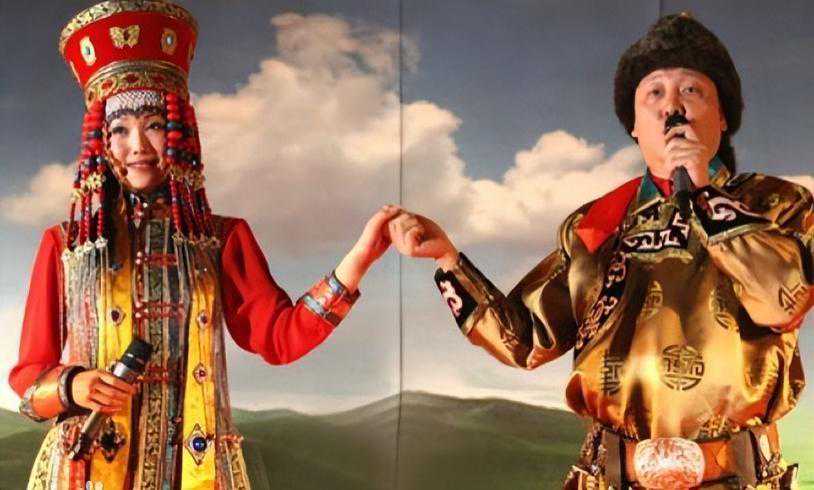 一对新人穿着蒙古族婚装,手牵着手在草原上放声歌唱。