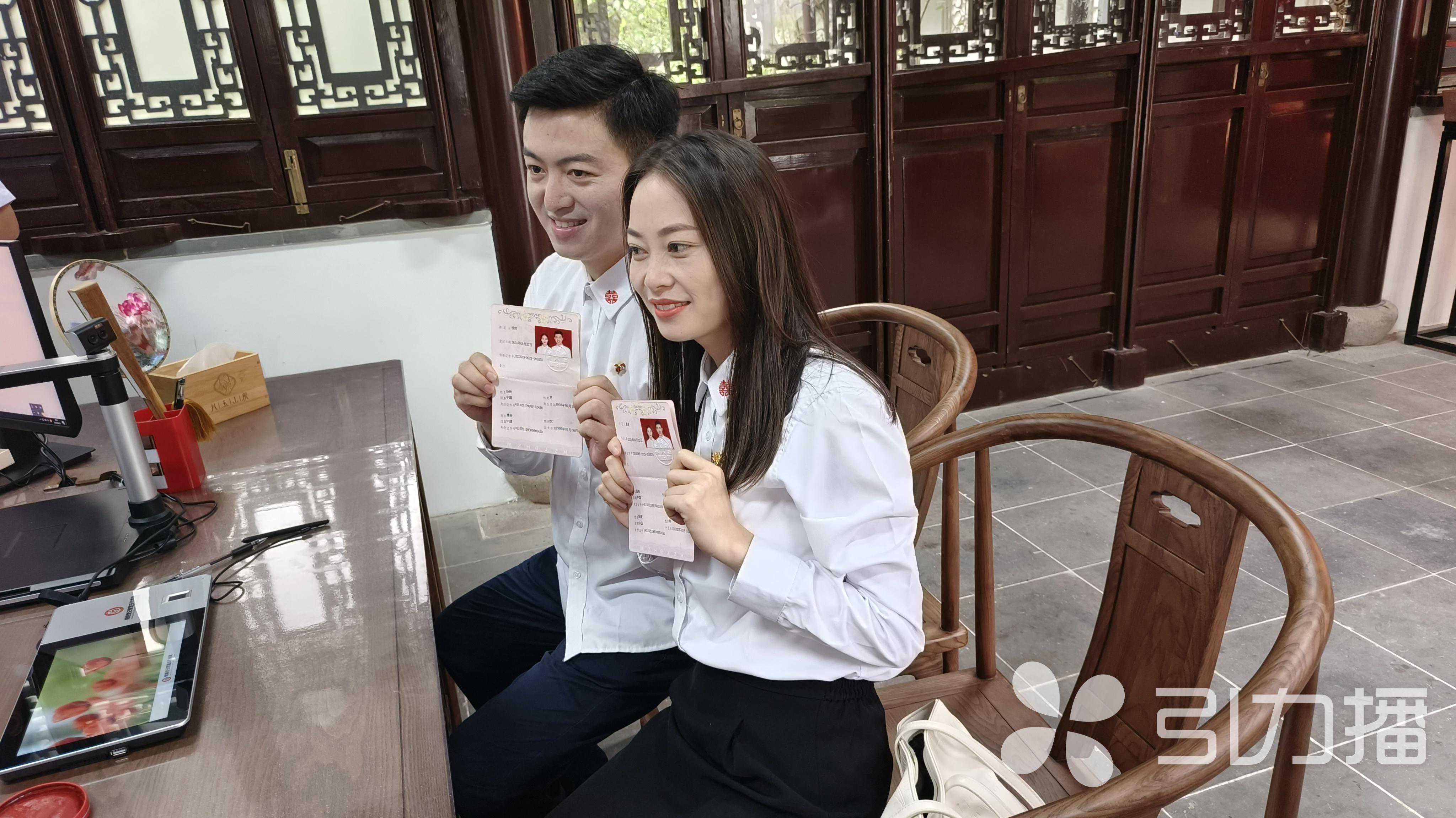 填写登记表、递上户口本、录入信息、按上手印……不到十分钟,作为第一对成功登记的新人,徐辉和童俊便拿到了“红本本”。“非常开心在这个特殊的日子里完成结婚登记,很高兴能让亭林园的山水一起见证我们的爱情。”徐辉说。
