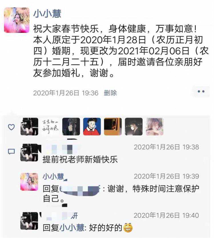 二人随即与各自父母解释,没想到通情达理的父母听后一致支持,决定将婚期推迟一年。二人随后分别在朋友圈和微信群告知亲朋婚礼取消,意想不到再次收到一片盛赞和祝福留言。