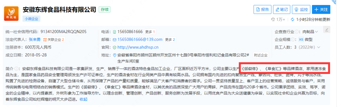 据报道,在东辉科技的生产车间,记者看到几名工人正在对劣质槽头肉上的淋巴结和甲状腺进行整修。但记者发现,经过整修的槽头肉上,腺体依然清晰可见。问题曝光后,《每日经济新闻》记者通过企查查发现,该公司相关简介显示:“其生产的《御徽缘》、《阜食汇》等品牌酒店食材,以其优良的品质深受广大用户的青睐,产品流传在国内20多个省市。”