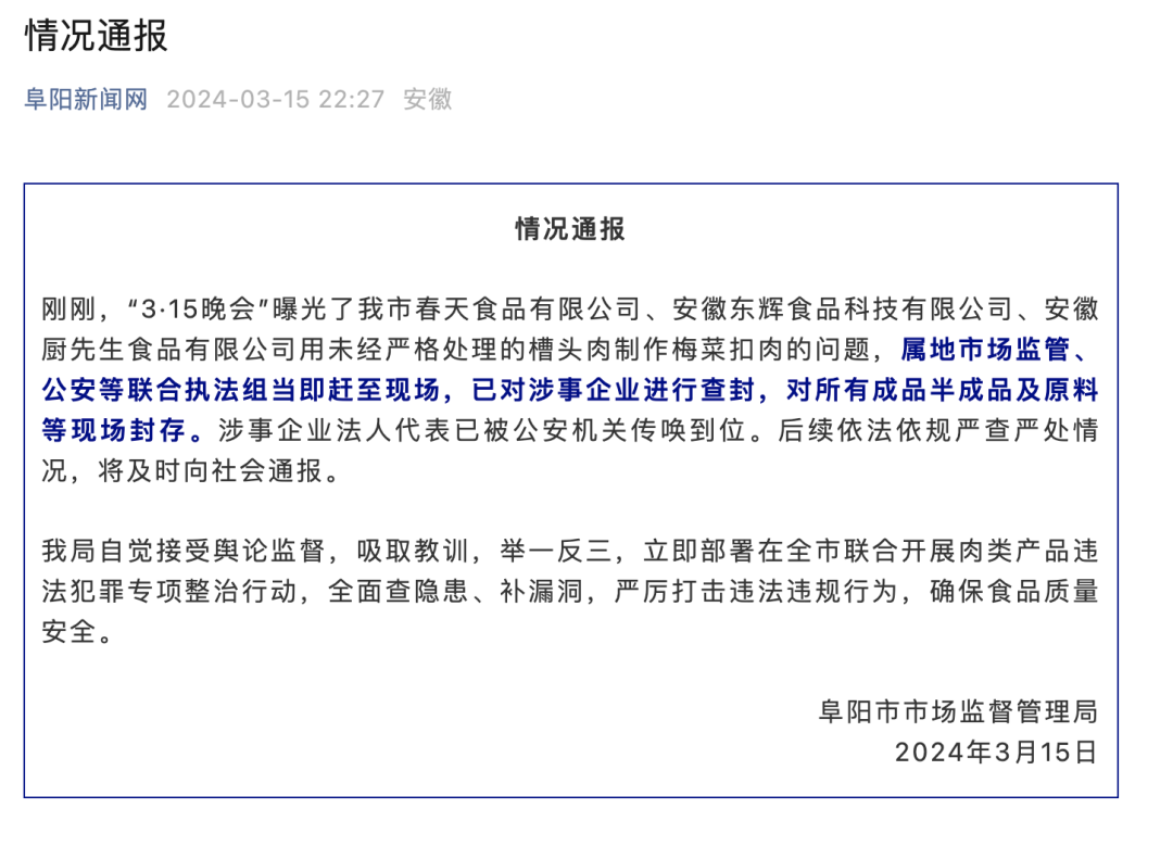 刚刚,“3·15晚会”曝光了我市春天食品有限公司、安徽东辉食品科技有限公司、安徽厨先生食品有限公司用未经严格处理的槽头肉制作梅菜扣肉的问题,属地市场监管、公安等联合执法组当即赶至现场,已对涉事企业进行查封,对所有成品、半成品及原料等现场封存。涉事企业法定代表人已被公安机关传唤到位。后续依法依规严查严处情况,将及时向社会通报。