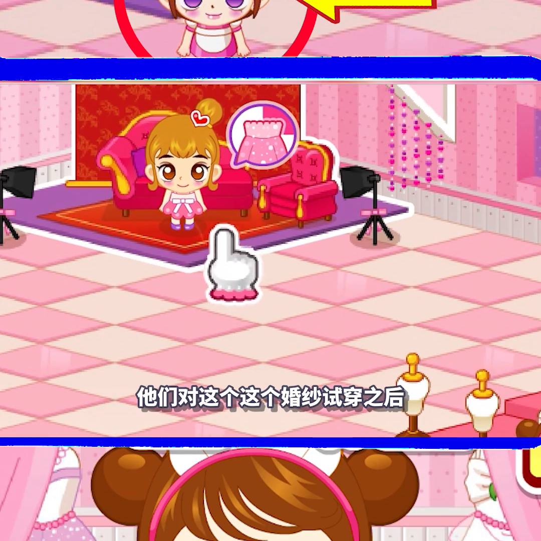 给本杂志给他看看,大家看啊这时候有客人试穿婚纱之前还要量一下,所以就还要先拿尺子,然后还会随机出现一些客人。他们对这个婚纱试穿之后,这个不满意对吧?还会要求你换一件。
