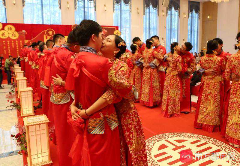 新郎挑红盖头。南都记者冯宙锋摄新人拥吻。南都记者冯宙锋摄新人领取婚书。此次活动由广州市民政局和从化区人民政府联合主办,活动包括“幸福广州浪漫起航”新婚集体婚礼和从化区婚姻家庭文化展等活动内容。