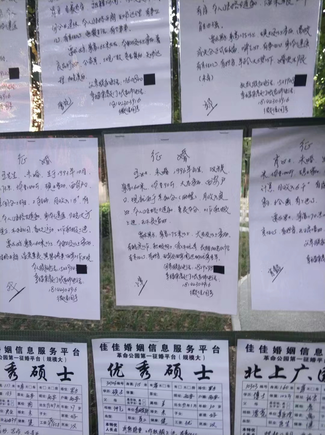 每逢周三、周日的时候,从公园正门进去,远远的就能望见熙熙攘攘的人群,树木之间拉起许多细绳子,上面密密麻麻挂满了五颜六色的A4纸一样大小的征婚信息卡片,还有挂在树梢上的各种征婚卡片,有的人更是将伞撑开将自己子女的信息卡片贴在上面。这一张张卡片上都“明码标价”,标注着年龄、婚姻状况、户籍、身高、房屋、工作、收入、家庭成员情况等信息,在等待别人的父母们翻牌子似的。