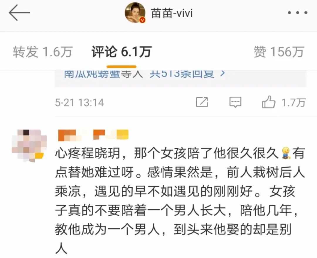 有不少人替其前女友程晓玥打抱不平,于是程晓玥莫名其妙被送上了热搜。或许是因为相爱多年却没有结果的感情让人心疼和唏嘘,可是爱情里没有对错,就算曾经两个人再怎么好,错过了就是错过了。最终两人在2017年11月分手。很多人都说程晓玥三年的陪伴输给了苗苗不到一年的相识,只是没有在对的时候遇到对的人,两人和平分手之后,也都在各自的领域里闪闪发光,也都活出了更好的自己,我们不必再为此再惋惜,祝福他们。