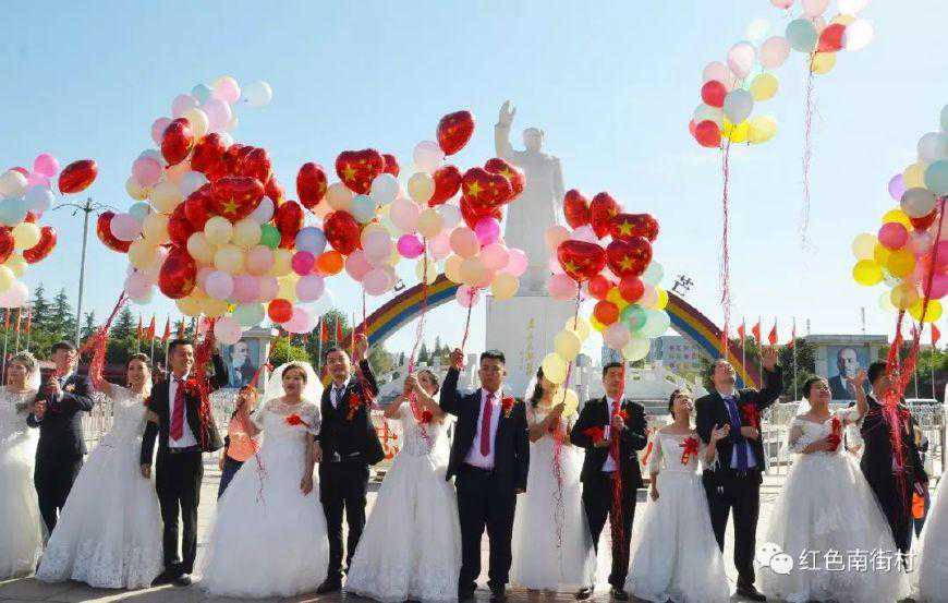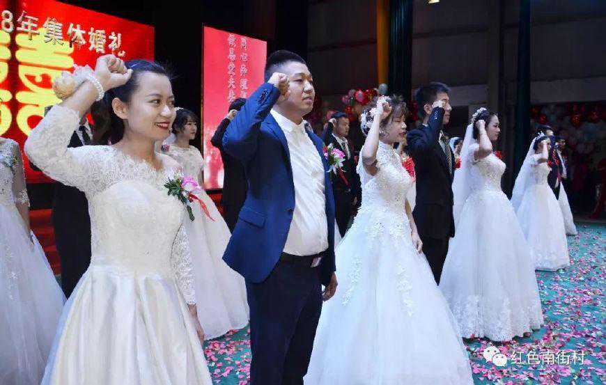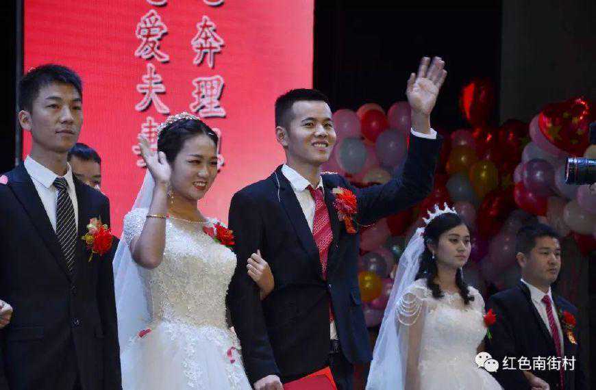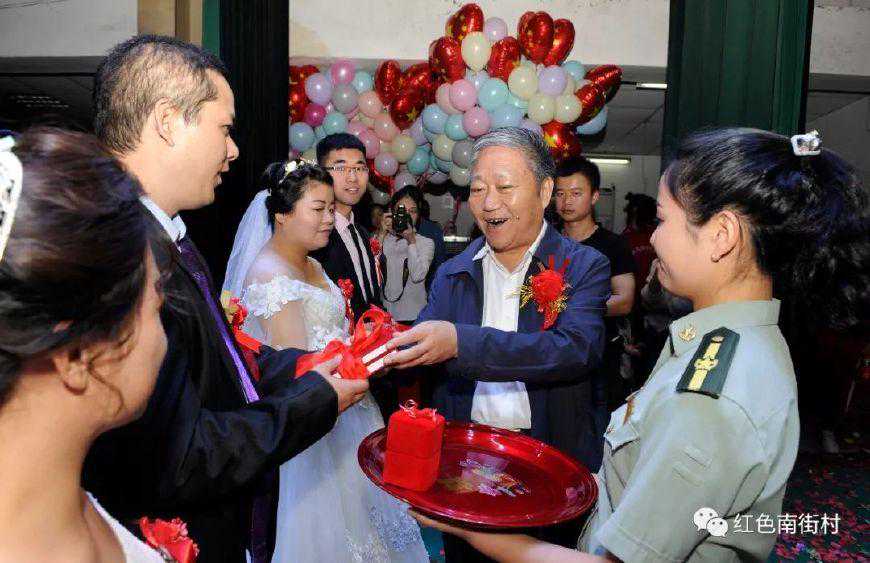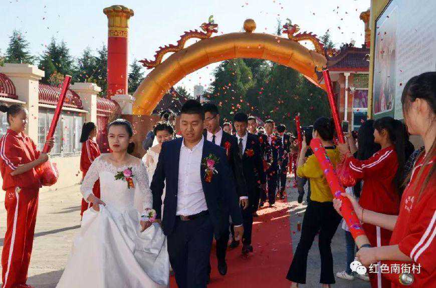举办集体婚礼是南街村的优良传统,是移风易俗、树立新风,加强精神文明建设的重要举措,用红色文化教育人、武装人,是正确引导青年、服务青年、教育青年的具体体现,充分体现了村党委对青年的关心和爱护,体现了集体大家庭的无比优越。本次婚礼,村党委为新人们主婚,八大部主任和全体党员为新人们证婚。怀着无比感激、感动、感恩的心情,新人们分别敬拜了伟大领袖毛主席、主婚人、证婚人和父母,然后夫妻对拜。新郎代表王海园、新娘代表解静先后发言,感谢村集体为他们搭建了成长、工作和生活的良好平台,表示今后将继承父辈创业精神,发扬年轻人的拼搏创新精神,既经营好小家庭,更建设好大家庭,把南街事业不断推向新的台阶。新郎新娘喝下甜蜜的交杯酒后,集体进行宣誓,并合唱了《没有共产党就没有新中国》和《南街村之歌》。主婚人向新郎新娘赠送了《毛主席语录》和纪念品,并与大家合影留念。