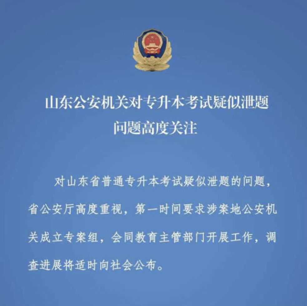 17日,山东公安回应称,对山东省普通专升本考试疑似泄题的问题省公安厅高度重视,第一时间要求涉案地公安机关成立专案组,会同教育主管部门开展工作,调查进展将适时向社会公布。
