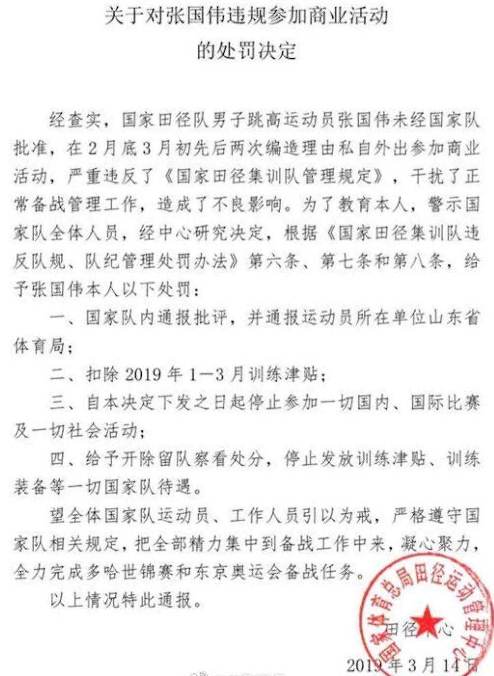 近日,国家体育总局田径运动管理中心下发的一条处罚决定在网上流传,该决定宣布的是对跳高名将张国伟的处罚。决定给予张国伟开除留队察看处分,同时扣除三个月训练津贴,停止参加一切国际国内比赛以及一切社会活动,剥夺国家队待遇等等。惩处的原因是张国伟编造理由私自外出参加商业活动。