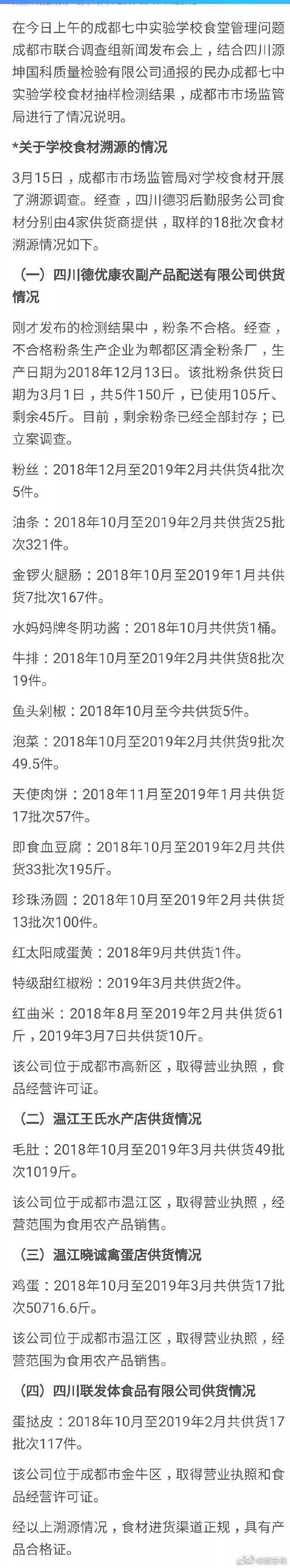 成都市市场监管局:溯源情况显示成都七中实验学校食材进货渠道正规