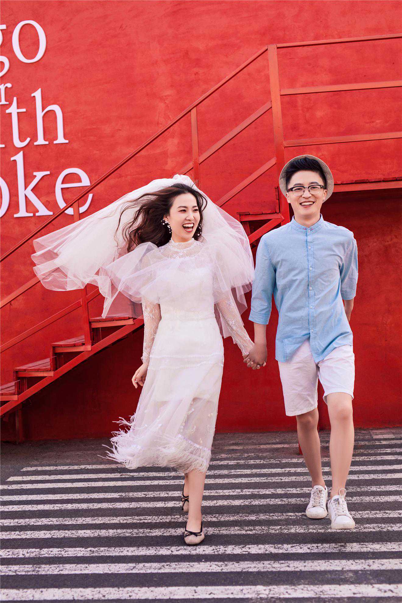 自由随性的街道拍摄,自然也可以穿着舒适的情侣装,不用扭捏地摆各种pose,而是自由的大步向前走,随风飘舞的头纱,洋溢着幸福的笑容,都让画面的糖分飙升。