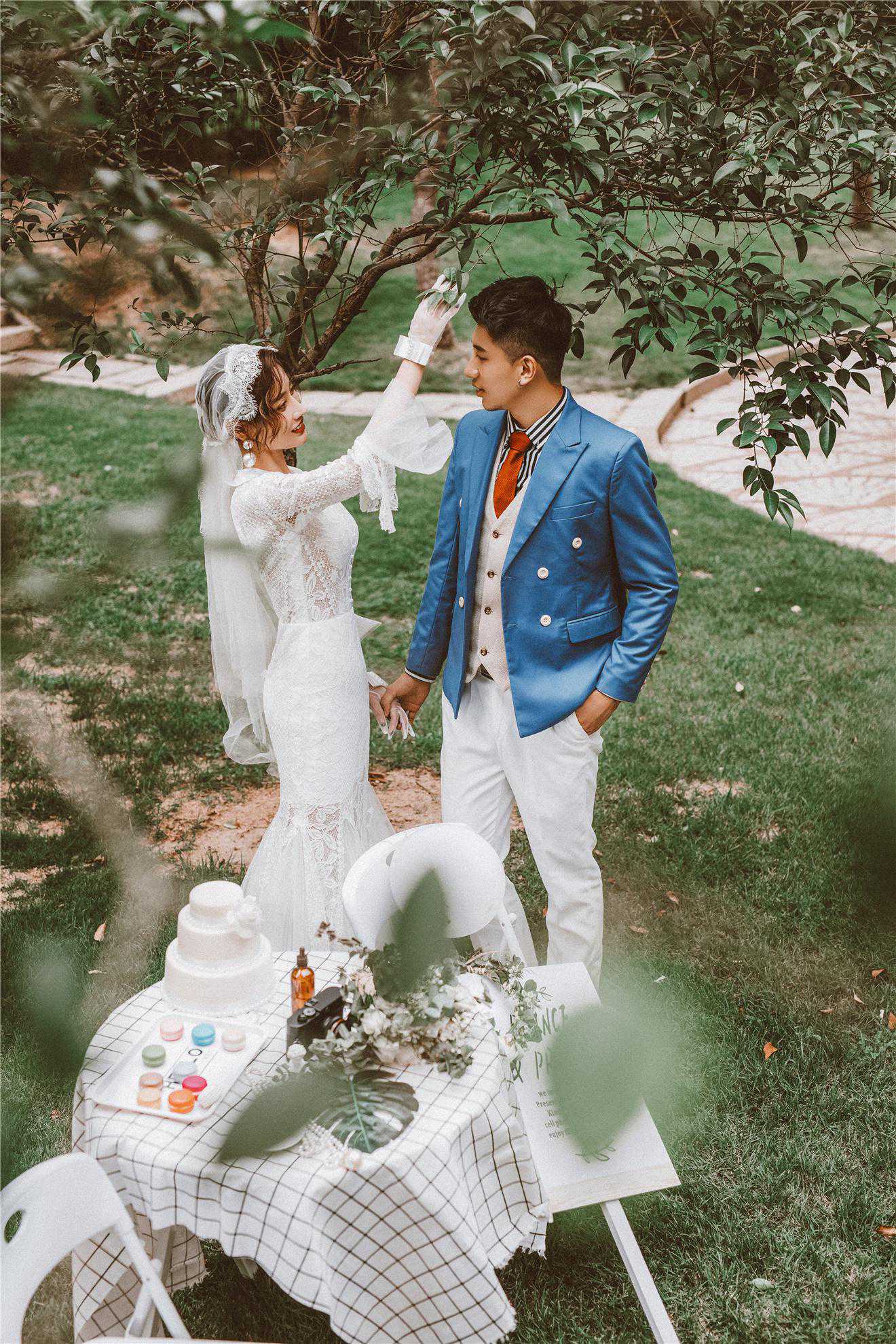 择一处草坪,置一个欧式的小圆桌,摆一些香槟甜点,就制造出不少浪漫的氛围感,再着一身鱼尾蕾丝礼服,和一个轻法式造型,与帅气的男主仿佛是在进行一个甜蜜的下午茶。