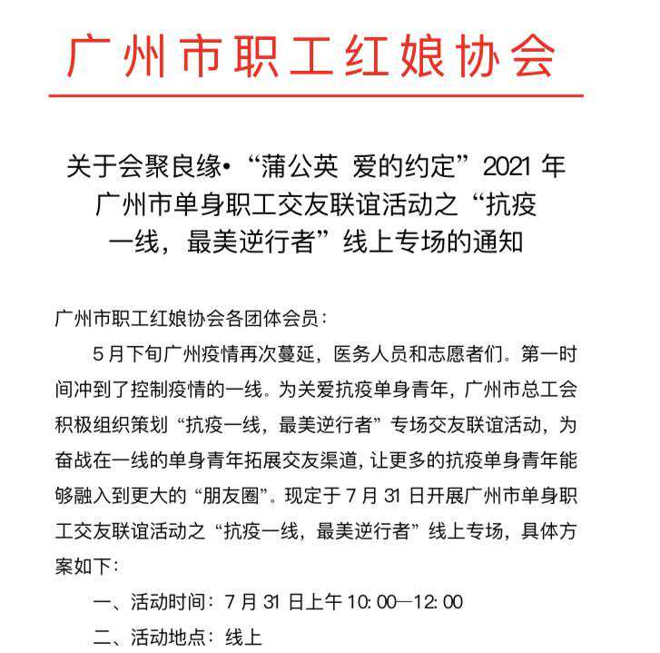 记者从一份《广州市职工红娘协会2021年活动汇总表》(以下简称《活动汇总表》)获悉,该协会每月至少举办一场主题单身职工交友联谊活动。每场的活动主题各有不同:2月适逢春节,政府号召广大职工“留穗过年”,当月协会推出“花城有爱穗岁有缘”广州市单身职工交友联谊活动;5月草长莺飞,适宜走向户外,协会举办广州市单身职工交友联谊活动之“种下同心树,共筑幸福梦”。根据该份《活动汇总表》,截至2021年8月底,今年以来,该协会将共计举办11场不同主题的线上、线下的交友联谊活动,累计参与的广州市单身职工为1008人次。“交友联谊活动的形式、场地、主题都在不断创新。形式从模仿‘非诚勿扰’到‘以茶会友’‘以花会友’,场地从固定场所到登山漫步、主题打卡和开心野炊等。还举办开设烘焙主题专场、电影专场,将交友联谊与植树、文化非遗传承结合起来。”广州市职工红娘协会活动组织策划工作人员牛晓斐说。
