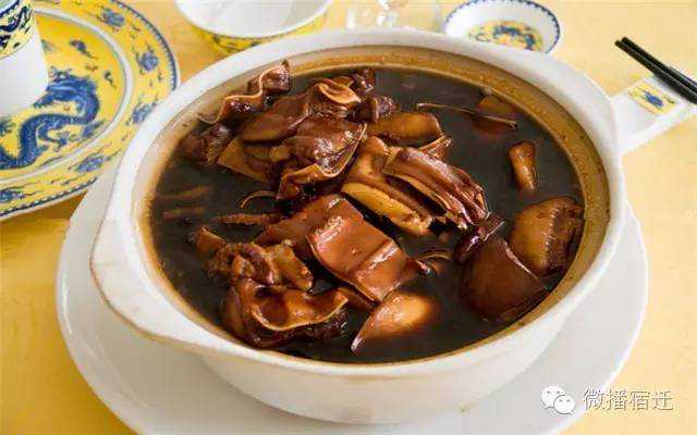 宿迁名吃,也称为宿迁黄狗猪头肉、乾隆老汤黄狗猪头肉,为清朝乾隆十二年(1747年)黄德所创。黄狗猪头肉传统手工技艺已入选宿迁市首批非物质文化遗产目录,此菜被列入《江苏名菜谱》。反正乾隆皇帝爱吃,其他的小编也就不多说了。