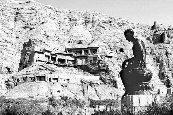 克孜尔石窟外景。克孜尔石窟是龟兹文化的一颗明珠。石窟前陈列的塑像是龟兹译经大师鸠摩罗什,他曾到长安主持译经。(资料图片)