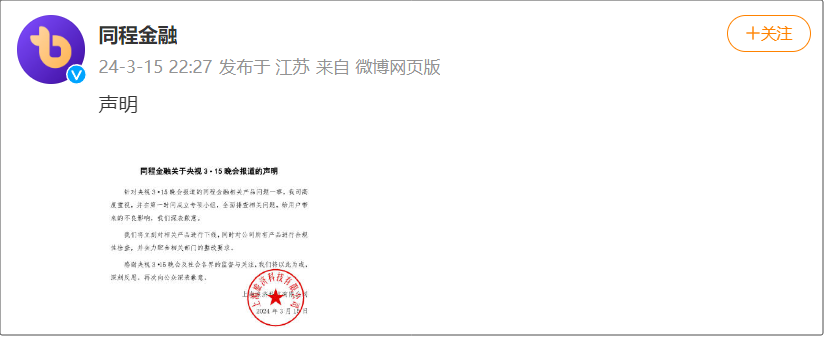 @同程金融发布道歉声明称,将立刻对相关产品进行下线,同时对公司所有产品进行排查,全力整改。