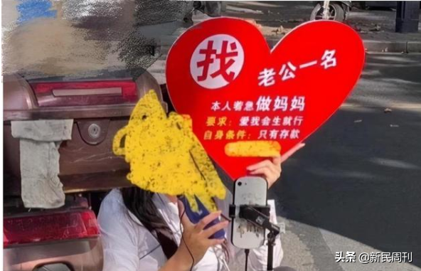 爬行一会后,女主播又蹲在路边,举起了一块“征婚”的招牌。细看过去,招牌上的文字同样突破想象。招牌上写道:爱我会生就行,只有存款。